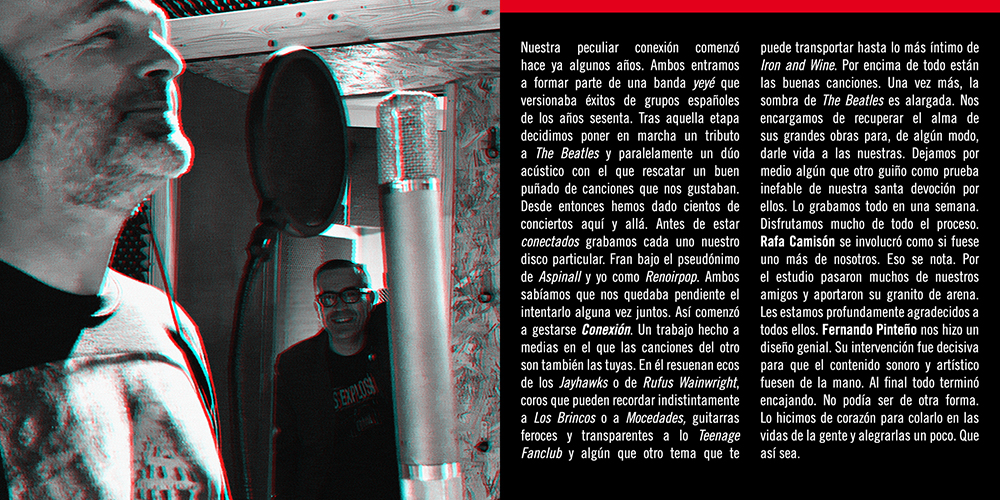 Diseño y marca para el disco «Conexión» del grupo Mojo Gallardo. Me pidieron reflejar idea de su concepto «conexión», dos músicos que aportaban sus diferentes visiones en sus seis canciones pero que en el conjunto del disco funcionaban como un todo coherente. Pensé en un futbolín en el que dos jugadores contrarios compartieran barra y meta.