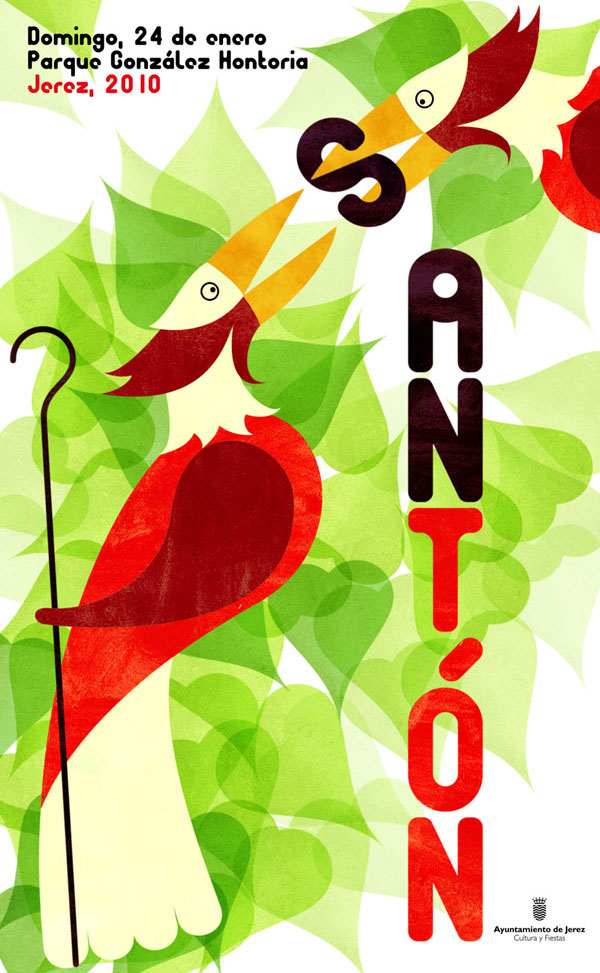 Cartel para la celebración de la Fiesta de San Antón 2010 encargado por la Delegación de Cultura y Fiestas del Ayuntamiento de Jerez. En él combiné las composiciones de las figuras ornitológicas que ilustraban antiguas láminas de la naturaleza con el juego visual de la dualidad de las imágenes que desarrollaron Escher y los pintores surrealistas. ¿Qué veis antes, el santo o los pájaros?